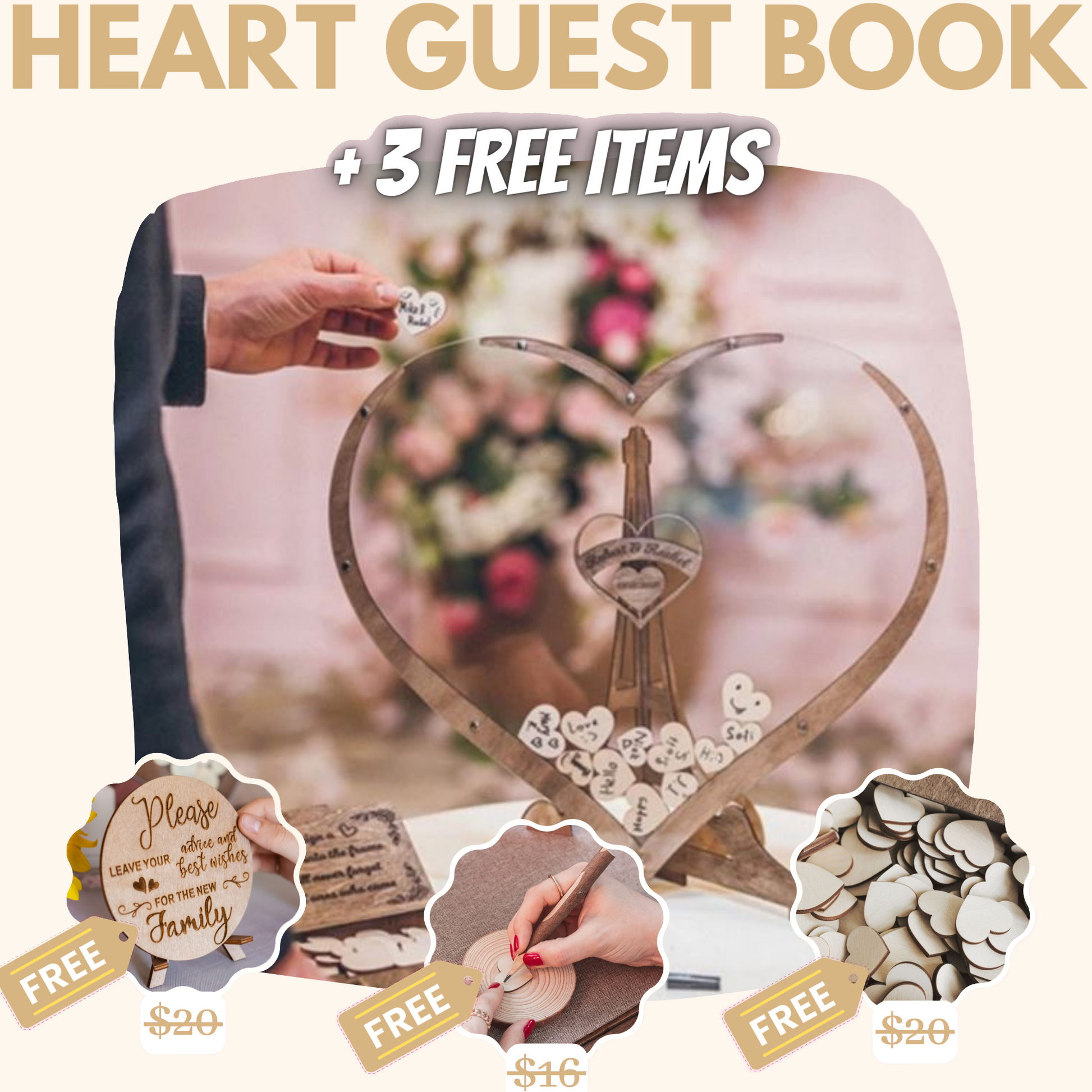 Hochzeitsgästebuch mit Holzherz + 3 KOSTENLOSE Boni