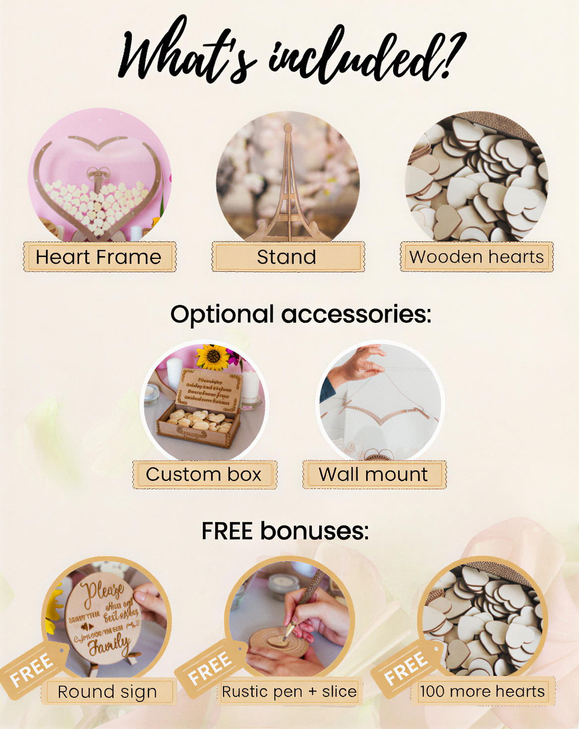 Price ALWAYS includes: Heart frame + wooden hearts + stand.