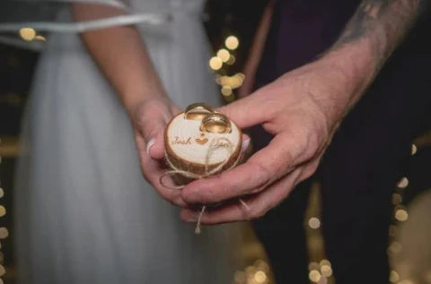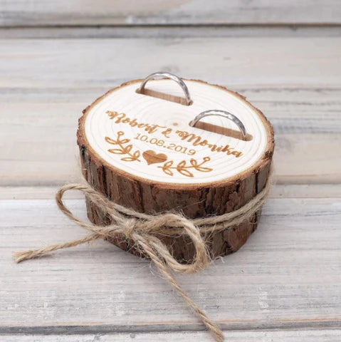 Handcrafted from real wood and personalized with your names and date, this rustic ring box is a beautiful symbol of your story. No two are alike—each one is a unique slice of nature, made just for you.