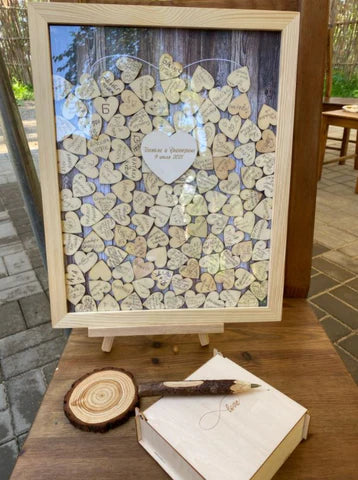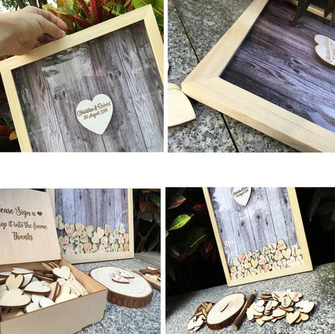 This isn’t just a guest book—it’s an experience. Guests leave their heartfelt messages on wooden hearts and drop them into a beautifully crafted frame. Unique, interactive, and unforgettable.