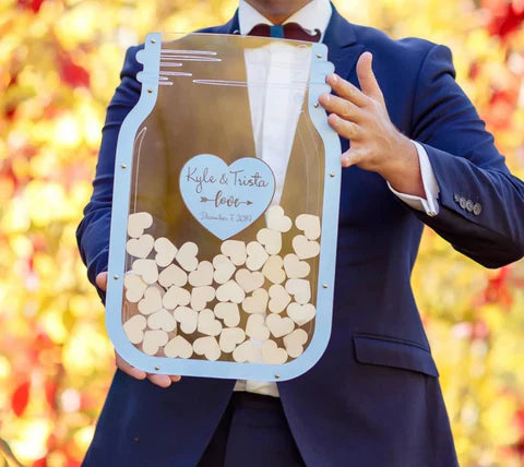"The mason jar guest book was such a charming addition to our rustic wedding! Guests loved signing the little hearts and dropping them in — now it's a keepsake we proudly display at home. So much better than a traditional guest book!"