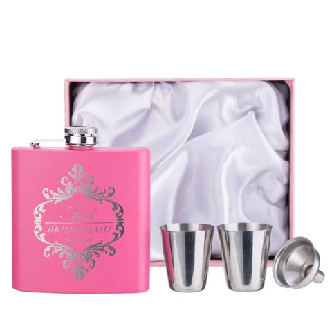 Raise your glass with our chic, personalized pink flasks — the perfect bridesmaid gift for your bridal squad.